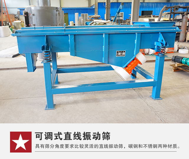 可調(diào)直線振動篩不同于的直線振動篩的地方,就是能夠調(diào)節(jié)直線振動篩的篩分角度。但其主要的振動來源還是振動電機的激振力,利用該激振力帶動物料在篩面上進行顆粒大小的篩選和分級。