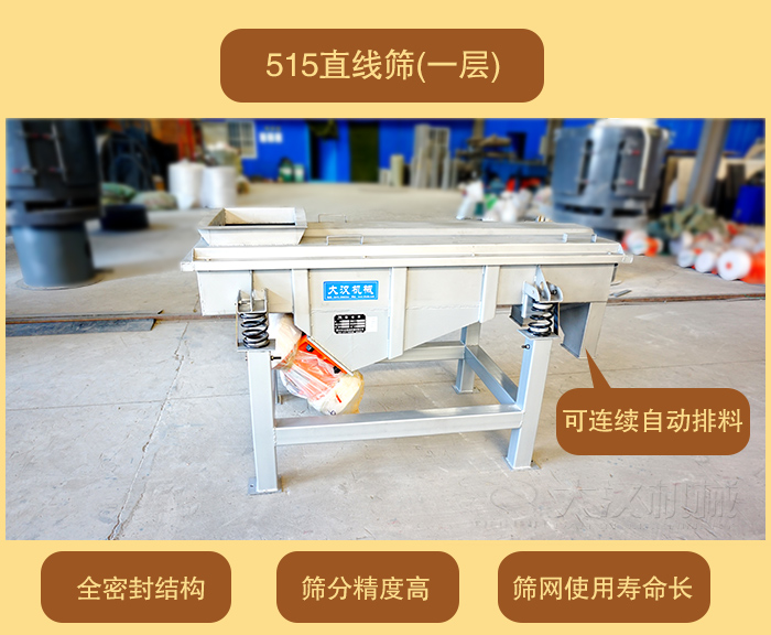 DZSF-515直線篩(寬)500mm×1500mm(長),體積小移動(dòng)方便,價(jià)格便宜。大漢直線振動(dòng)篩廠家可為客戶量身定做特殊要求的直線振動(dòng)篩(單層或多層)。515直線振動(dòng)篩按材質(zhì)分為304不銹鋼材質(zhì)和碳鋼材質(zhì)。